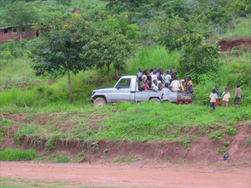 Public transit, as in these mini busses or big, Greyhound type busses, don’t travel to every village. They sometimes only go to the “boma”, the commercial centre of the area once a day. So in order to catch this “bus” you need to be very early waiting for it to come. The “bus” can only hold so many people and when full you have to wait till the next day. After that the traveller is on his own to find his way to the village he wants to visit. This may often involve a walk of some hours over very rough foot paths, all the while trying to carry his belongings.